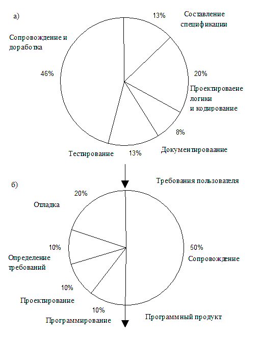 Типичное распределение затрат на разработку программного обеспечения показано на рис. 4.1.а (США) и рис. 4.1.б (РФ) [10, 11].
