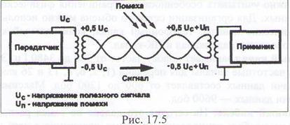 Витая пара. Является наиболее популярной физической средой для построения современных сетей. На сегодня это недорогой и универсальный кабель для создания локальных коммуникаций практически любого уровня сложности. Витая пара — это изолированные проводники, попарно свитые между собой некоторое число раз на определенном отрезке длины (рекомендуется не менее 13 витков на 1м длины), что требуется для уменьшения перекрестных наводок между проводниками. Такие линии как нельзя лучше подходят для создания симметричных цепей (рис. 17.5), в которых используется балансный принцип передачи информации. Приемник и передатчик гальванически развязаны друг от друга согласующими трансформаторами.