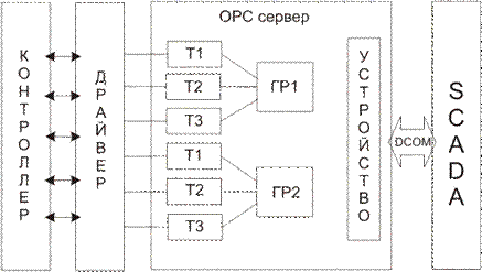 В ОРС все элементы данных объединяются в группы. Каждый элемент данных и группа имеют свое уникальное имя, и могут быть организованы в иерархическую структуру. Все элементы в каждой группе обновляются периодически, чере равные промежутки времени, причем обновление элементов происходит синхронно.