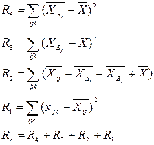 Где - значение признака, полученное в k-м наблюдении на i-м уровне фактора A и на j-м уровне фактора B,– общее среднее, - эффект фактора A на i-м уровне, - эффект фактора B j -м уровне, - эффект, вызванный взаимодействием факторов, - случайная компонента.