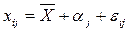 Где - значение признака Х, полученное в i-м эксперименте (i=1,..., n j), соответствующем j-му уровню фактора A , – общее среднее , - вклад в величину , обусловленный действием фактора A (эффект фактора A на j-м уровне, - неслучайная величина), - случайная компонента, вызванная влиянием всех прочих факторов.