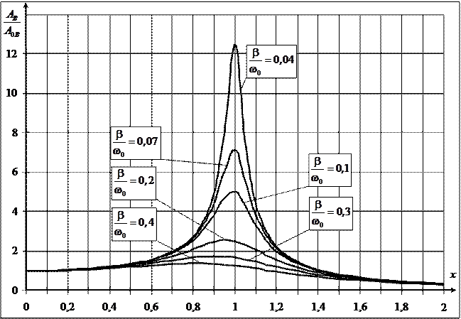 Обозначим и построим графики зависимости амплитуды от частоты для различных значений параметров. (График зависимости амплитуды вынужденных колебаний от частоты называется резонансной кривой).