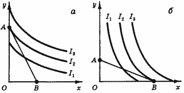 Точки А (рис. 8,а) и В (рис. 8,б) носят название углового решения задачи потребительского выбора в противоположность внутреннему решению (точка Е на рис. 5).