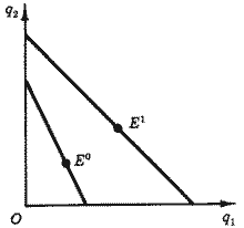 Сторонний наблюдатель (например, статистик) может зафиксировать точки Е0 и Е1, соответствующие покупкам в базисном и текущем периодах, но он не может “увидеть” точку Е01. Все, что можно оценить объективно по наблюдениям в базисном и текущем периодах, изображено на рис. 3: это бюджетные линии, определяемые номинальным доходом и ценами, и объемы покупок. На рисунке точка Е0 лежит выше новой бюджетной линии, что свидетельствует об увеличении реального дохода. Оперируя только наблюдаемыми данными, мы вынуждены несколько поступиться теоретической чистотой формулы (2) и заменить точку Е01 точкой Е1: