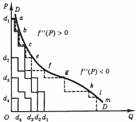 На рис. 7 ступенчатая линия abcefgkim представляет рыночную кривую спроса, полученную суммированием по горизонтали четырех частных кривых спроса dd, а огибающая плавная кривая DD — кривую спроса при достаточно большом числе покупателей.