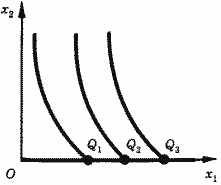 Будем считать, что увеличение затрат одного из ресурсов при неизменных затратах другого позволяет увеличить выход продукции. Это значит, что производственная функция - возрастающая функция каждого из своих аргументов. Через каждую точку плоскости ресурсов с координатами х1, х2 проходит единственная изокванта. Все изокванты имеют отрицательный наклон. Изокванта, отвечающая большему выходу продукта, располагается правее и выше изокванты для меньшего выхода. Наконец, все изокванты будем считать выпуклыми в направлении начала координат.