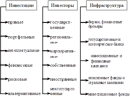 В инновационной сфере выдающуюся роль играют долгосрочные инвестиции, так как инновационный процесс, как правило, длится 3-5 лет и больше. В специальной литературе приводятся разные варианты классификации инвестиций, инвесторов и инфраструктуры. На рис. 2.8 показанный один из них.