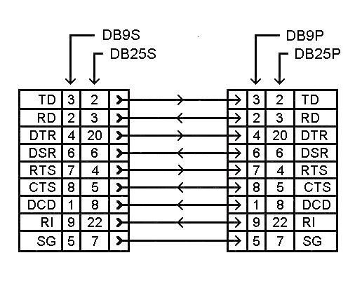 Это правило предполагает, что разъемы АКД могут подключаться к разъемам АПД непосредственно или через переходные "прямые" кабели с розеткой и вилкой, у которых контакты соединены "один в один". Переходные кабели могут являться и переходниками с 9- на 25-штырьковые разъемы (рис. 3.1.1.5).