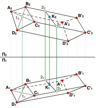 На этом же чертеже показано построение горизонтальной проекции K1 точки K по заданной ее фронтальной проекции K2 из условия принадлежности точки K грани BB'C'C. Горизонтальная проекция точки K построена с помощью вспомогательной прямой 23, проведенной через точку K в плоскости BB'C'C.