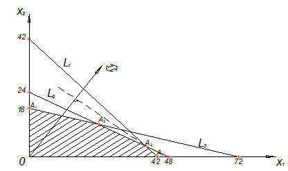 Построим вектор набла . Последней точкой встречи линии уровня с многоугольником решений будет точка (см. рис.3) с координатами: , , являющимися решениями системы уравнений