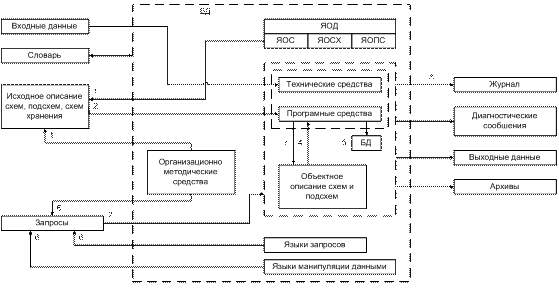 Схемы, подсхемы и схемы хранения проектируются и описываются на языке описания данных в соответствии с методическими указаниями (1). Эти описания переносятся на магнитные носители, вводятся в систему (2) и переводятся в объектное или загрузочное представление (3), которые хранятся в составных библиотеках. Затем подготавливаются и вводятся в систему входные данные (4) и производится загрузка БД (5). Запросы к БД формируются на языке диалога (6) и вводятся в систему (7). Для нормальной работы БД используют дополнительные элементы – журналы, архивы…(8)