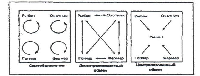 Чтобы разобраться в природе рынка, представим себе примитивное экономическое сообщество из четырех человек: рыбака, охотника, гончара и фермера. Рассмотрим три разных способа удовлетворения этими людьми своих нужд.