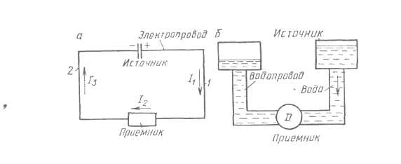 Электрический ток можно сравнить с током воды в трубе. Заряды в проводнике, подобно воде в трубе, перемещаются одновременно во всех сечениях. Поэтому значение тока во всех сечениях проводника одинаково (1).