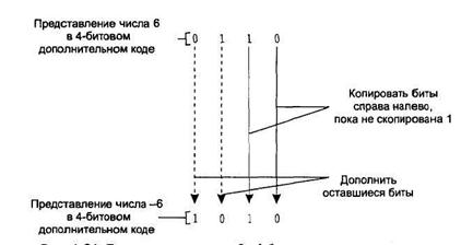 Существует удобное соотношение между записью положительного и отрицательного чисел, одинаковых по модулю. Они совпадают, если их читать справа налево, до первой единицы включительно, а с этого места они являются дополнениями друг друга (дополнением набора битов (complement) является набор битов, который получается путем замены всех нулей на единицы и наоборот; например, 0110 и 1001 — дополнения друг друга). Например, в 4-битовом представлении (см. рис. 1.20) записи чисел 2 и -2 заканчиваются на 10, но запись числа 2 начинается с 00, а числа -2 — с 11. Это наблюдение помогает найти алгоритм для получения записи отрицательного числа из записи положительного и наоборот, когда эти числа равны по модулю. Мы просто переписываем исходную последовательность до тех пор, пока не будет переписана единица, затем мы переписываем оставшиеся разряды, заменяя их дополнениями (рис. 6). Обратите внимание, что самое маленькое отрицательное число в представлении в дополнительном коде не имеет положительного эквивалента.