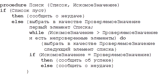 Рисунок 1 - Алгоритм последовательного поиска, записанный с помощью псевдокода
