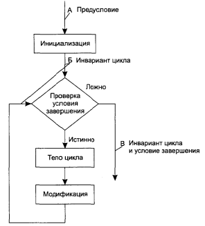 В качестве примера рассмотрим типичную циклическую структуру while-do, представленную на рис. 6. Предположим, как следствие предусловий, заданных в точке А, мы можем установить, что определенное утверждение истинно при каждой проверке условия окончания цикла (точка В) на протяжении всего процесса повторения. Такое утверждение внутри цикла называется инвариантом цикла (loop invariant).Как только повторение завершается, выполнение переходит к точке С, где мы можем заключить, что истинны как инвариант цикла, так и условие его окончания. (Инвариант цикла остается истинным, поскольку проверка условия окончания не изменяет никаких величин в программе, а условие окончания истинно, поскольку в противном случае цикл бы просто не завершился.) Если комбинация этих положений означает то, что мы хотим видеть на выходе, наше доказательство корректности можно завершить, просто показав, что компоненты инициализации и модификации цикла в конечном счете приводят к условию окончания.