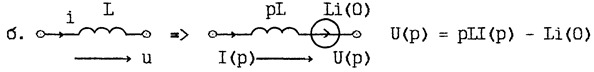 Уравнения элементов в операторной форме аналогичны по виду уравнениям элементов цепи постоянного тока. Вместе с тем реактивные элементы L и С характеризуются операторными сопротивлениями рL и 1/рС. В их операторные эквиваленты вводятся вспомогательные источники напряжения - Li(0) и u(0)/р.