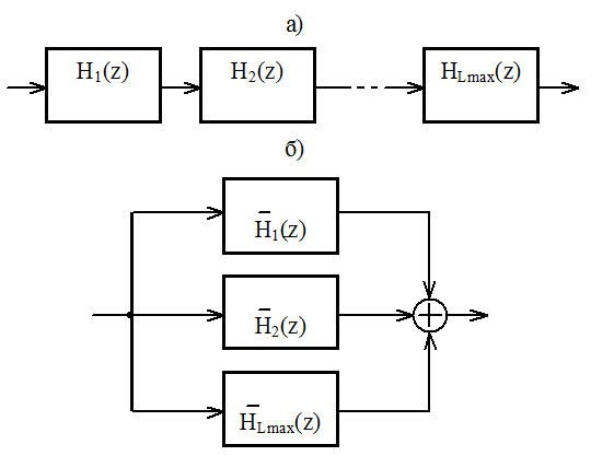 Представив системную функцию фильтра в виде произведения или суммы системных функций второго порядка, представим фильтр в виде последовательного или параллельного соединения звеньев второго порядка.