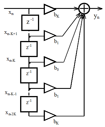 На рисунке показан нерекурсивный фильтр, у которого коэффициенты системной функции b симметричны относительно середины линии задержки.