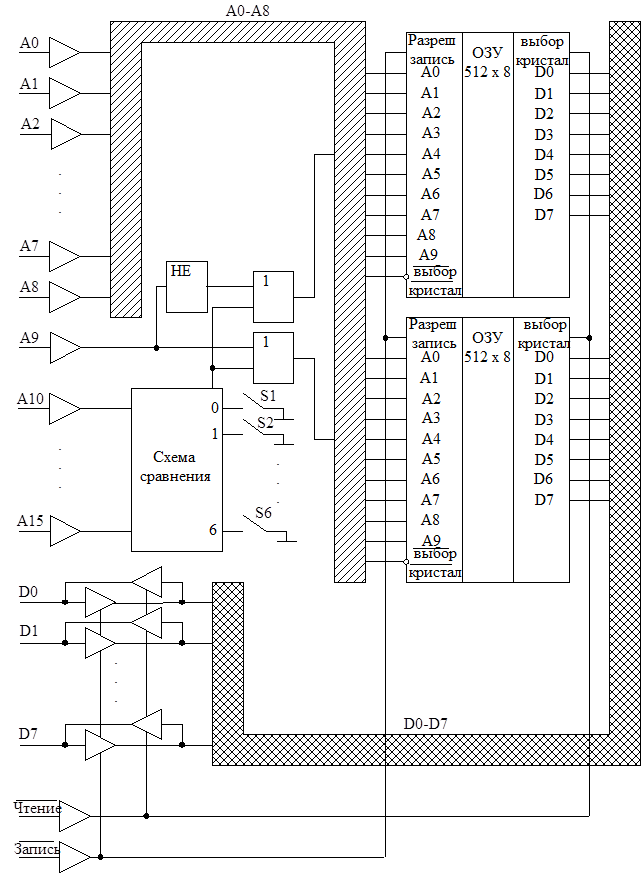 Адреса А10-А15 сравниваются с набором данных адресов, набранного посредством тумблеров S1-S6. Выходной сигнал схемы сравнения содержит информацию о том, имеет ли место обращение к данной памяти. Если адресные сигналы совпадают с адресом полученным набором тумблеров, то на выходе схемы сравнения формируется сигнал логического «0», который разрешает выбор кристалла на данной плате памяти. Если не совпадают сигналы А10-А15 с S1-S6 , то на выходе схемы сравнения формируется сигнал логической «1»,запрещающий обращение к данной плате памяти. Если на линиях S1-S6 все «0», то плата памяти будет реагировать на адреса от 0 до 1 кБ, если S1=1, S2-S6=0 — на адреса 1кБ-2кБ и т.д. Следовательно, наращивание памяти возможно до 64 кБ с помощью тумблеров S1-S6.