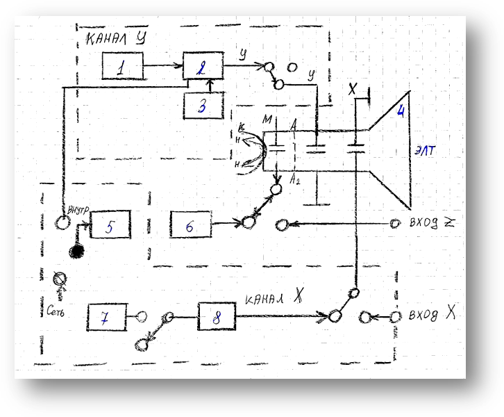 На вход поступает исследуемое напряжение, которое либо ослабляется на делителе напряжений «АТ» (1), либо усиливается на усилителе «УС» (2) и поступает на пластины вертикального отклонения. С помощью калибра амплитуд «КА» (3) меняется коэффициент усиления. Усилитель преобразует исследуемый сигнал до величины достаточной для отклонения луча по вертикали на весь экран.