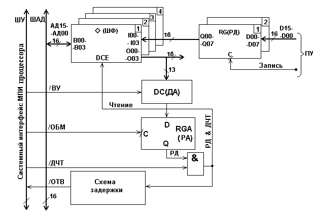 Ведущий на линии АД12-АД00 выставляет адрес регистра РД и сигнал /ВУ. Адрес проходит через шинные формирователи (ШФ) всех устройств, подключённых к интерфейсу, и поступает на дешифраторы адреса (ДА). В исходном состоянии ШФ включены на вывод информации. На ДА поступает также и сигнал /ВУ, разрешающий дешифрацию адреса. На выходе ДА устройства, в котором адрес, выставленный ведущим, совпал с адресом, заданным для данного устройства, формируется сигнал активного уровня (на схеме – РД). Ведущим устанавливается сигнал /ОБМ, по которому адрес устройства в виде сигнала РД записывается в регистр адреса (РА). Ведущий сбрасывает адрес с линий АД12-АД00 и сигнал /ВУ. Активный уровень сигнала РД на выходе Q регистра адреса открывает схему & и назначает ведомым данное устройство. Дальнейшие действия ведущего в этой процедуре относятся только к назначенному ведомому.Ведущий устанавливает сигнал /ДЧТ, который проходит через схему &, схему задержки, формируя сигнал ответа периферийного устройства /ОТВ. Одновременно сигнал с выхода схемы & поступает на входы DCE шинных формирователей ШФ и переключает их на ввод данных. Данные, записанные в регистре данных РД, проходят через ШФ и поступают на линии АД15-АД00. Ведущий принимает данные и сбрасывает сигнал /ДЧТ. Сброс сигнала /ДЧТ приводит к снятию сигнала /ОТВ и переключению ШФ в исходное состояние. Ведущий после снятия сигнала /ОТВ ведомым сбрасывает сигнал /ОБМ, завершая процедуру чтения информации из регистра данных. Сигнал РД будет сброшен в следующем цикле назначения нового ведомого.