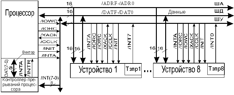 При прерывании процессора с неинтерфейсным адресом вектора прерывания запросы на прерывание /INT7 - /INT0 формируются устройствами либо элементами, входящими в процессор (рис. 4.16). Устройства, которым необходимо прервать работу процессора, устанавливают свои триггеры запроса прерываний Тзпр1 – Тзпр8. Сформированные ими сигналы /INT7 – /INT0 поступают по шине управления в контроллер прерываний процессора. Контроллер прерывает работу процессора и, в соответствии с приоритетом поступивших сигналов, передаёт необходимый адрес вектора прерывания в процессор по его локальным шинам. По адресу вектора прерывания процессор переходит на подпрограмму обслуживания прерывания. По завершению обслуживания устройства процессор возвращается к выполнению прерванной программы.