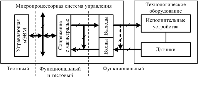 Тестовое диагностирование производится путем подачи на диагностируемый объект специальных тестовых воздействий и сравнения реакции объекта на эти воздействия с эталонными ответами. В технологическом оборудовании используются оба способа диагностирования. На рис. 9.1 показана структурная схема МПСУ оборудования и возможные способы диагностирования работы отдельных частей системы. Данное разделение условно и на практике могут использоваться оба способа одновременно.