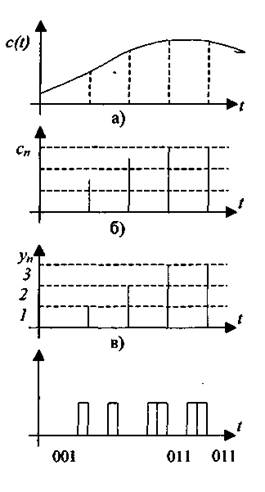 Преобразование непрерывного первичного аналогового сигнала в цифровой код называется импульсно-кодовой модуляцией (ИКМ). В телекоммуникациях в качестве основания кода выбрана двоичная последовательность, реализуемая с наименьшими аппаратными затратами. Основными операциями при ИКМ являются операции дискретизации по времени, квантования (дискретизации по уровню дискретного по времени сигнала) и кодирования.