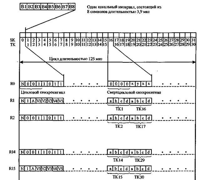 ТК - номер телефонного канала; RO, .... R15 - циклы в сверхцикле; SK - канальный интервал; В1, ....В8 - кодовое слово длиной 8 бит; N - бит резервирован для международного использования (значение символа не определено, в настоящее время должен принимать значение 1); А - передача сигнала аварии к аппаратуре ИКМ противоположного конца линии связи; VI V5 - символы, предназначенные для национального использования (на цифровых трактах, пересекающих государственную границу, эти символы должны иметь значение 1); х — резервный символ (в случае, когда он не используется, должен иметь значение 1); у - символ, используемый для индикации выхода из сверхциклового синхросигнала; а. Ь. с, d- символы для организации общего канала сигнализации (ОКС), если Ь, с и d не используются для ОКС, они должны иметь следующие значения: b = 1, с = 0, d= 1.