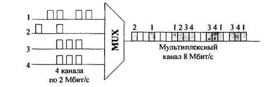 При асинхронном мультиплексировании распределение временных интервалов в выходном канале мультиплексора между входными каналами происходит обычно свободным образом, например, по требованию.