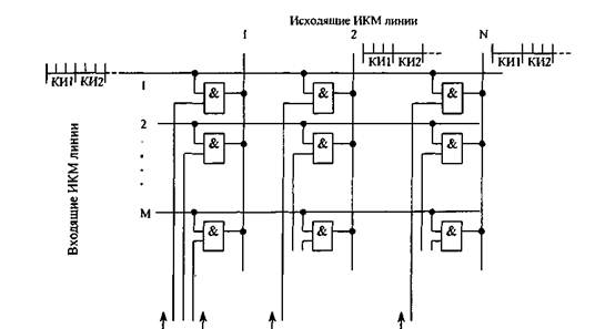Поясним принцип преобразования пространственной координаты цифрового сигнала, использовав для этого условную коммутационную матрицу (рис. 2.11). Матрица состоит из вертикальных и горизонтальных шин и элементов «И» (электронные ключи).