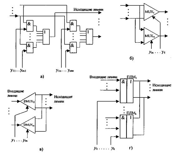 Комбинационная часть S-ступени может быть реализована различными способами: на электронных ключах (рис. 2.13, а), на интегральных схемах средней степени интеграции -мультиплексорах и демультиплексорах (рис. 2.13, б и в), или на БИС матричной структуры - программируемых логических матрицах (ПЛМ)(рис.2.13,г).