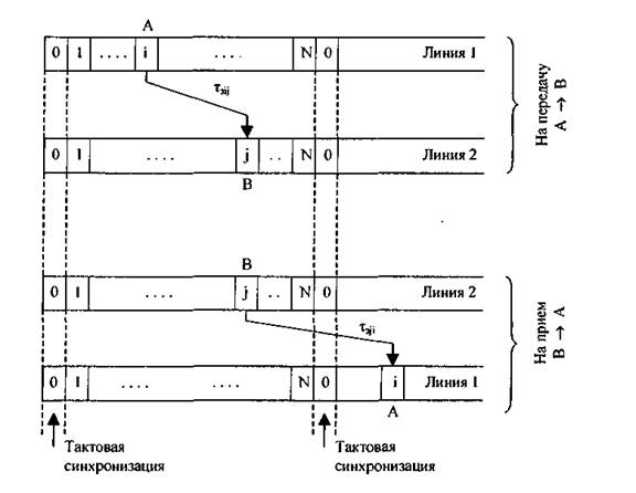 Все сигналы ИКМ линий синхронизированы по циклам. Согласно адресной информации, поступающей в управляющее устройство блока в 16-м канальном интервале, необходимо установить соединение абонента А с абонентом В. В адресе указано, что речевая информация от абонента А передается в i-м канальном интервале ИКМ линии 1, а абоненту В предоставлен j-й канальный интервал ИКМ линии 2. Принцип пространственно-временной коммутации канальных интервалов в прямом и обратном направлениях иллюстрирует рис. 2.14. Как видно из рисунка, для передачи речевой информации из i-гo канального интервала ИКМ линии 1 в j-й канальный интервал ИКМ линии 2 (от абонента А к абоненту В) необходимо задержать эту информацию на время т3i. В то же время сигнал, передаваемый в j-м канальном интервале линии 2, должен быть задержан на время т32, и передан в i-м канальном интервале следующего цикла линии 1. Таким образом, передача речевой информации в прямом и обратном направлениях должна происходить в разных циклах.