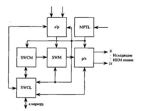 Преобразователи s/p, p/s кроме преобразования кодов выполняют функции соответственно модулей приема и передачи. Блок коммутации может состоять из нескольких модулей пространственно-временной коммутации SWM, которые располагаются в виде условной матрицы. При этом блок управления также будет состоять из нескольких модулей управляющих ЗУ SWCM, управляющих группой модулей SWM (как правило, условной горизонталью).