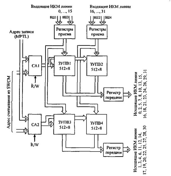 ЗУПВ 512x8 - ЗУ с произвольной выборкой 512x8 бит; R/W- сигнал записи в ЗУ временной коммутации (SWM); ВШ1,..., ВШ4 - входные шины; CAI, CA2 - селекторы адреса