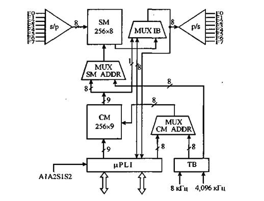 В схеме ECI можно выделить следующие функциональные блоки: синхронизирующее устройство (ТВ); преобразователи последовательного кода ИКМ кодового слова в параллельный и наоборот (s/p и p/s); речевое ЗУ (SM); управляющее ЗУ (СМ); логический интерфейс микропроцессора; мультиплексоры (мультиплексор адреса управляющей памяти - MUX SM ADDR, мультиплексор внутренней ИКМ шины - MUX IB, мультиплексор адреса речевой памяти - MUX CM ADDR).