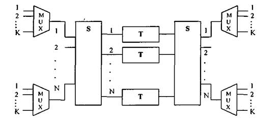 Базовая структура при к = г = 1 позволяет строить цифровые КП малой емкости. Графическое изображение такого трехзвенного поля показано на рис. 3.3. Первый и третий каскады имеют по одному пространственному коммутатору NxM цифровых трактов, а второй каскад содержит Г-ступень, состоящую из М временных коммутаторов. Емкость цифрового КП определяется параметром N S-ступени и количеством каналов п в цифровой линии и рассчитывается как N х п. Так, при использовании ЦСП ИКМ-30 и пространственных коммутаторов 16x16 емкость КП составит 512 канальных интервалов.