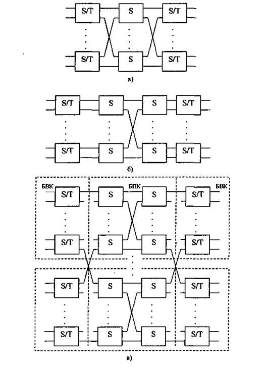 Структуры цифровых КП третьего класса появились в конце 70-х годов благодаря возможности создания соответствующих интегральных схем. Поля этого класса являются в известной мере универсальными поскольку позволяют однотипно строить системы коммутации практически для всего диапазона емкостей: малой, средней и большой. При этом наращивание емкости происходит, в основном, за счет увеличения количества звеньев пространственной коммутации, переходя от более простых структур S/T-S-S/T (рис. 3.10, а) к более сложным S/T-S-S-S/T (рис. 3.10, б) и S/T-S-S-S-S/T, поскольку увеличение емкости самой S-ступени является более дорогим решением. Часто при проектировании коммутационного поля ступени временной и пространственной коммутации объединяются в соответствующие блоки: блок временной коммутации (БВК) и блок пространственной коммутации (БПК). Тогда наращивание емкости КП происходит путем простого добавления определенного количества БВК и БПК (рис. 3.10, в).