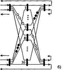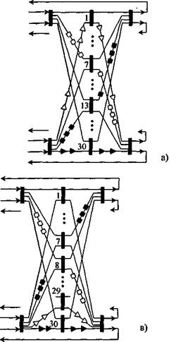Алгоритм выбора пар соединительных путей в цифровом КП зависит от того, к какому типу относится поле: разделенному или неразделенному. В разделенных цифровых КП между входной и выходной ИКМ линиями может устанавливаться только одно соединение (например, слева направо, как это показано на рис. 3.22, а). Это приводит к тому, что цифровое КП разбивается на два идентичных поля для каждого направления связи. Обычно соединительные пути для одного разговора устанавливаются в таком цифровом КП одинаковым образом для обоих путей, и для управления ими нужна лишь одна память для обеих половин поля.