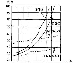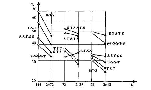 Рассматриваемый подход позволяет сопоставить друг с другом КП различных типов - разделенные и неразделенные. На рис. 3.27 приведены зависимости Т, =f(L) для различного числа канальных интервалов в ЦСП при фиксированной емкости N = 4320 канальных интервалов, равных 0,68 Эрл на один канал, р = 0,1%, к= 5, способе поиска соединительных путей «от точки к точке» и последовательной передаче кодовых слов по каналу. Анализ этих зависимостей показывает, что разделенные поля, как правило, экономичнее неразделенных. Кроме того, стоимость разделенных и неразделенных полей уменьшается при увеличении числа канальных интервалов в ЦСП. Следовательно, если стоимость вторичного мультиплексирования в цифровом КП невысока, целесообразно применять его всегда.