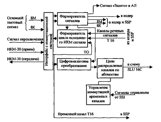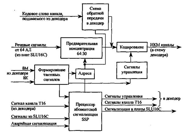 Поступающие из плат SLU16C речевые сигналы поступают на схемы SUC. Мультиплексор, управляемый процессором абонентской сигнализации SSP, осуществляет предварительную концентрацию нагрузки (каждой из 64 АЛ предоставляется один из 30 временных каналов внутренней линии ИКМ-30; при отсутствии свободных временных канальных интервалов абоненту подается сигнал «Занято»).