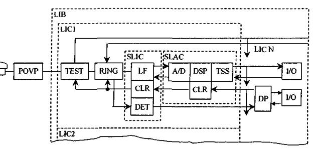 LIB - группа из 128 абонентских комплектов; LIC - электронные абонентские комплекты; POVP - первичная защита от перенапряжений; TEST - реле для соединения с шиной контроля; RING - реле для подачи вызывных сигналов; LF - запитка микрофонов, дифсистема; CLR (в модуле SLAC) - реле управления; DET -детектирование сигналов; A/D - аналого-цифровой н цнфроаналоговый преобразователи; DSP - передача цифровых сигналов; TSS - формирование временных каналов; CLR (в модуле SLIC) - контроль микросхемы SLIC; DP - микропроцессор; I /О - устройство ввода/вывода