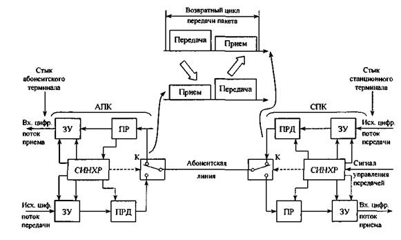 Переключение станционного и абонентского оборудования на режимы передачи или приема осуществляется коммутаторами К по сигналам, получаемым от устройства синхронизации (СИНХР). Стыки информационных потоков на обоих концах осуществляются по 4-проводной схеме. Входящая цифровая информация записывается в ЗУ и преобразуется передатчиком в короткие пачки цифровых сигналов, которые с более высокой скоростью передаются по линии. Скорость передачи пачек должна быть такой, чтобы эффективная скорость передачи была равна или превышала скорость цифрового потока на входе, иначе часть информации будет потеряна.