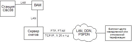 Сервер счетов и центр биллинга могут быть соединены с помощью LAN или DDN и другой WAN. На нижних уровнях для передачи счетов используются протоколы TCP/IP, X.25 и другие, а на прикладном уровне – стандартные протоколы FTP и FTAM. Для центров тарификации, которые не требуют обеспечения жестких характеристик связи в реальном времени, счета могут передаваться в таких формах, как совместное использование файлов, вывод на магнитооптический накопитель, стример и др.