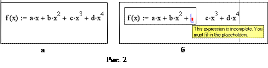 При нажатии на любую из кнопок этих окон изображенный на ней символ появляется в той части экрана, где в данный момент расположен курсор (красный крестик или синий уголок). Курсор можно перемещать по экрану с клавиатуры клавишами , , ® , ¯ или с помощью мыши, щелкнув ею в нужном месте экрана. С красного крестика начинается новое выражение, синий уголок находится всегда внутри какого-либо выражения. Если вы начали писать какую-то формулу и случайно вышли из нее, не закончив, вернитесь обратно, пока не появится синий уголок, в противном случае вы начнете новую формулу, не связанную с предыдущей. Убедиться в этом можно, отодвинув за черную рамочку только что набранную часть формулы. На рис. 2 показано неправильное написание функции f(x). На первый взгляд кажется, что все нормально (см. рис. 2, а). На самом деле, часть этой формулы набрана как самостоятельное выражение, не связанное с предыдущим (см. рис. 2, б).