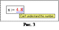 В пакете MathCad интервалы изменения какой-либо величины пишутся через две точки, которые появляются на экране, при нажатии кнопки m..n . Если набрать две точки с клавиатуры, MathCad укажет в этом месте на ошибку (Рис. 3).