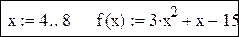 Задание 4. Задать функцию f(x):=3x2 + x – 15 в интервале xÎ[4; 8]: