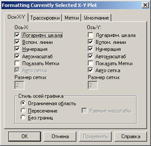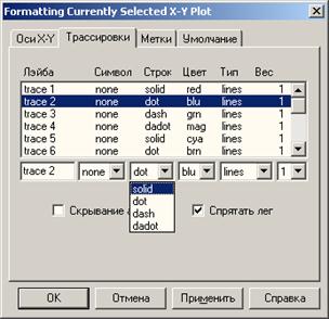 окне можно, например, отметить галочкой вспомогательные линии по осям X и Y (Grid Lines), логарифмическую шкалу по оси Х (Log Scale) и т.д. Чтобы отредактировать каждую кривую по отдельности, нужно щелкнуть по вкладке Traces (Трассировки), выбрать нужную кривую (по счету) и задать необходимые характеристики. На рис. 6, б показано, как изменить вид второго графика с пунктирной (dot) на сплошную (solid). Каждое изменение можно пронаблюдать, щелкнув по кнопке Применить.