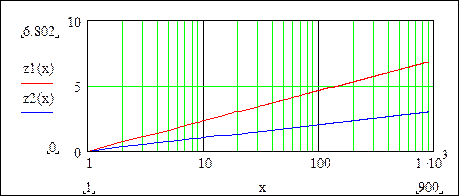 Задание 6. Самостоятельно построить графики функций z1(x) = ln(x); z2(x) = log(x) на интервале x Î (1; 900). Построить координатные линии и ввести логарифмическую шкалу по оси х. Логарифмы в логарифмической шкале должны приобрести вид прямых линий (Рис. 8).